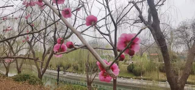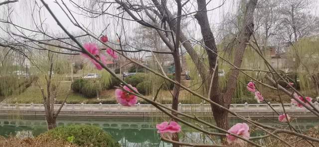 天气变冷,不耽误聊城运河岸边的红梅绽放。朱砂梅在河边开得正欢。
