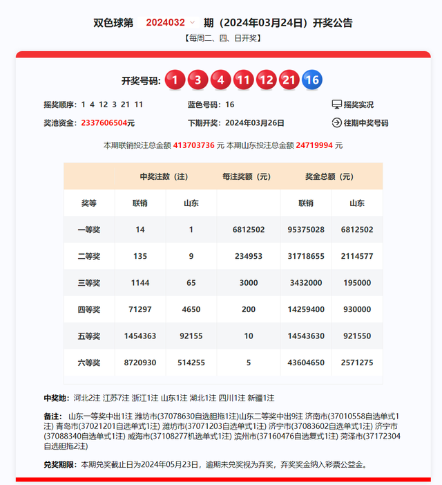 温故而知新 让昨天告诉今天,让历史告诉未来。 回顾昨天不是目的,之所以回顾昨天,是为了更好的拥抱今天。 上期双色球销售额4.13亿元。 上期双色球一等奖中出14注。每注奖金6812502元。 二等奖中出135注,每注奖金234953元。 六等奖中出8720930注。 双色球奖池资金累计金额23.37亿元。 昨天返奖还能说得过去,最起码奖池里面没有再上涨。真的不希望双色球的奖池再增加了。20多亿元啊,一天的利息就得多少钱呀?直接利息都给谁了呢?真的挺好奇的。