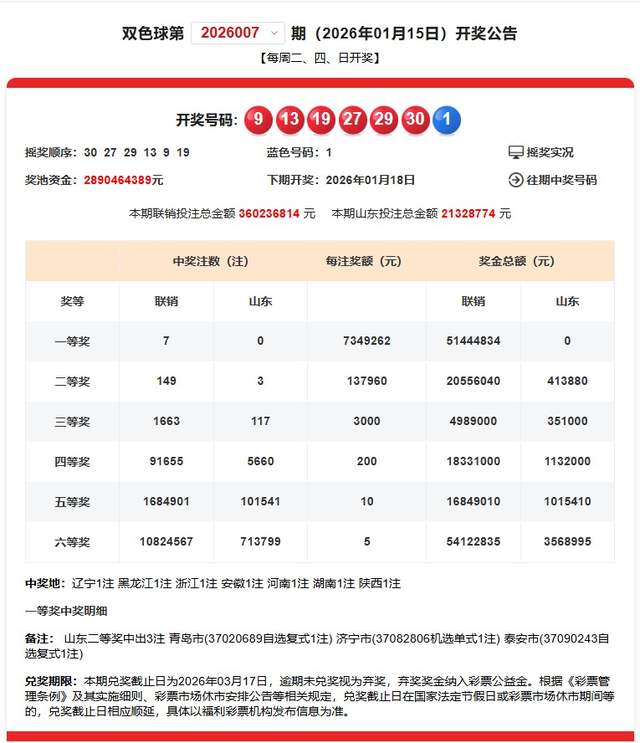 温故而知新 让昨天告诉今天,让历史告诉未来。 回顾昨天不是目的,之所以回顾昨天,是为了更好的拥抱今天。 上期双色球销售额3.60亿元。 上期双色球一等奖中出7注。每注奖金7349262元。 二等奖中出149注,每注奖金137960元。 六等奖中出10824567注。 双色球奖池资金累计金额28.90亿元。