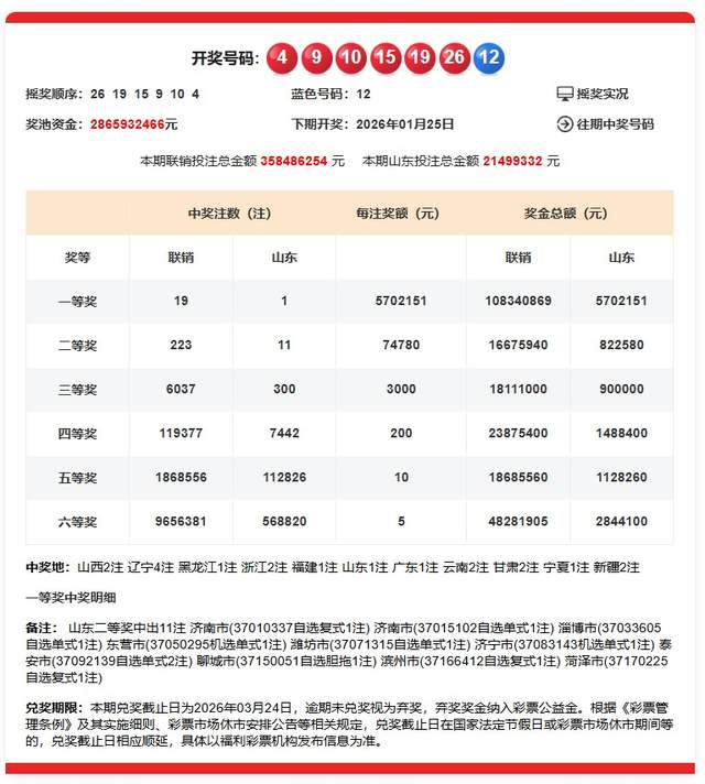 温故而知新 让昨天告诉今天,让历史告诉未来。 回顾昨天不是目的,之所以回顾昨天,是为了更好的拥抱今天。 上期双色球销售额3.58亿元。 上期双色球一等奖中出19注。每注奖金5702151元。 二等奖中出223注,每注奖金74780元。 六等奖中出9856381注。 双色球奖池资金累计金额28.66亿元。
