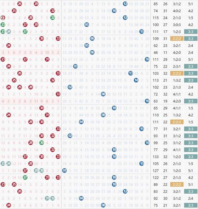 专业玩彩双色球红球: 龙头:01 05 07。 凤尾:31 32 33。 连号:09 10 11、13 14 15、27 28 29。 直落号:05 07 16。 隔期号:02 31 32。 邻码斜连码:15 17 21 23 25。 冷号:01 08 11 14 17。 专业玩彩双色球红球综合推荐: 双色球红球15码:01 05 07 09 11 13 14 15 17 21 23 25 28 29 33。 朋友们,到这里咱们的红球号码就分析完了,下面咱们再看看蓝球号码。