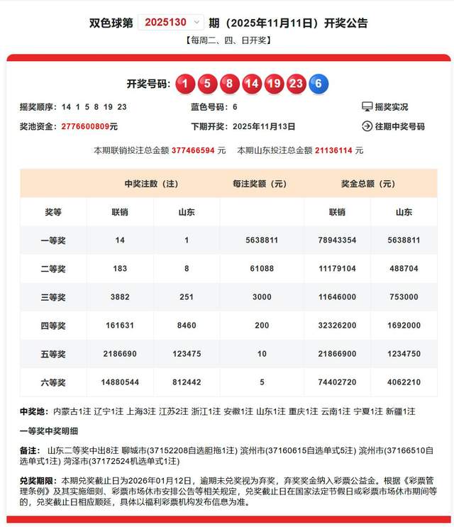 今天是2025年11月13日,星期四。今天是2025年第131期福彩双色球游戏开奖的日子。