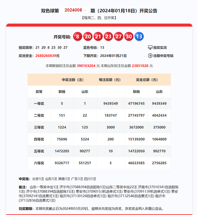 上期双色球一等奖中出5注。每注奖金9439349元。
