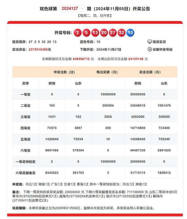 温故而知新 让昨天告诉今天,让历史告诉未来。 回顾昨天不是目的,之所以回顾昨天,是为了更好的拥抱今天。 上期双色球销售额4.38亿元。 上期双色球一等奖中出5注。每注奖金10000000元。 二等奖中出165注,每注奖金200294元。 六等奖中出9897466注。 双色球奖池资金累计金额23.75亿元。 既然派奖,就拿出点诚意来,派奖的时候,销量高了,返奖反而更低了,奖池累积奖金竟然还在上涨,这样的派奖有什么意义呢?是不是有点戏耍彩友?