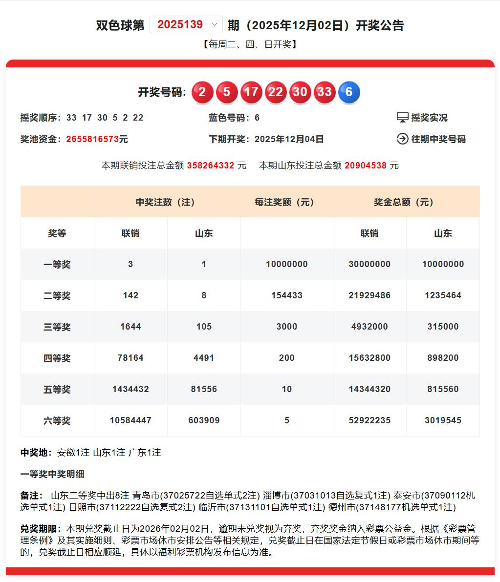 今天是2025年12月4日,星期四。今天是2025年第140期福彩双色球游戏开奖的日子。