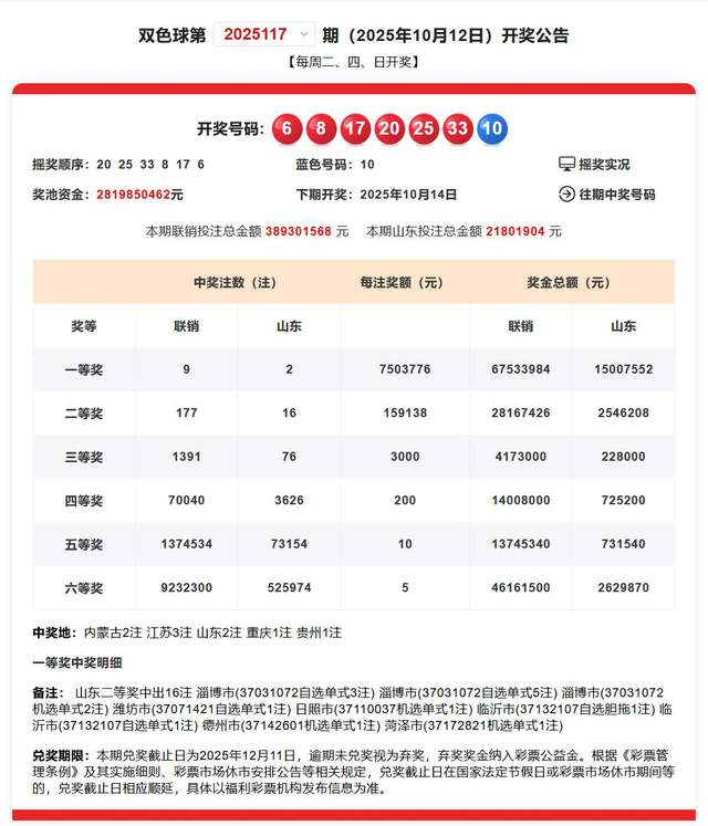 温故而知新 让昨天告诉今天,让历史告诉未来。 回顾昨天不是目的,之所以回顾昨天,是为了更好的拥抱今天。 上期双色球销售额3.89亿元。 上期双色球一等奖中出9注。每注奖金7503776元。 二等奖中出177注,每注奖金159138元。 六等奖中出9232300注。 双色球奖池资金累计金额28.19亿元。 一等奖9注也不算少,二等奖177注也能说得过去,6等奖稍微有点少了。